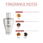 This creation opens with a combination of fresh florals leading in to a heart of voluptuous spicy floral notes, which will captivate & lead the user in to a ambery woody musky base leaving the wearer enchanted in its charisma.