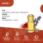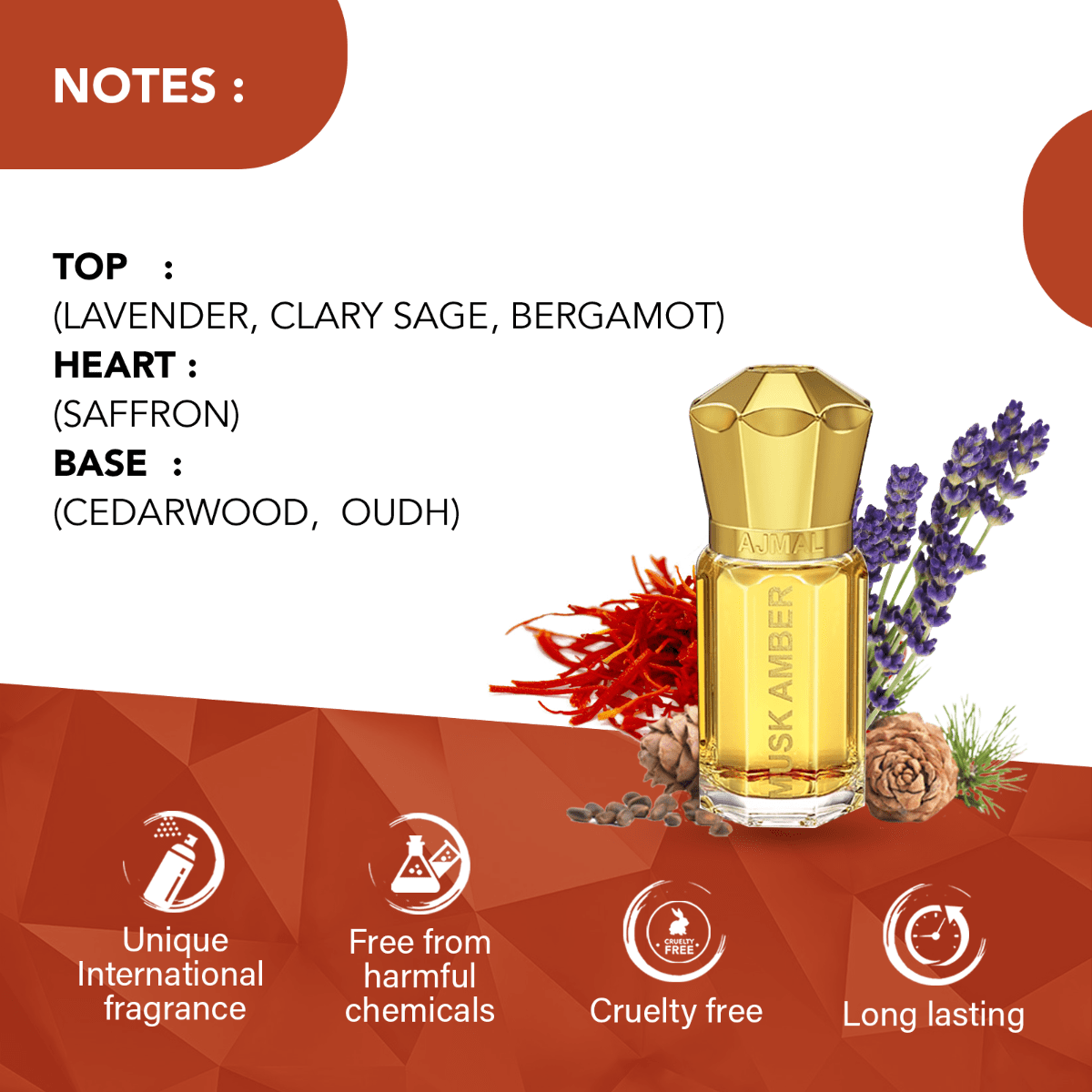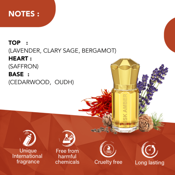Musk Amber is a perfect balance of sophistication and freshness that represents a woody & spicy profile.this bold fragrance is for the gentlemen of all generations.the scent is a classic amalgamation of aromatic notes of relaxing and soothing lavender, herbal clary sage & playful bergamot at the top escorted by rich saffron & praline accord that adds a touch of sweetness and gives a contemporary spin to the fragrance. oudh and cedarwood at the base evokes the specific idea of a masculine elegance as well as rounds off the fragrance with a bang.