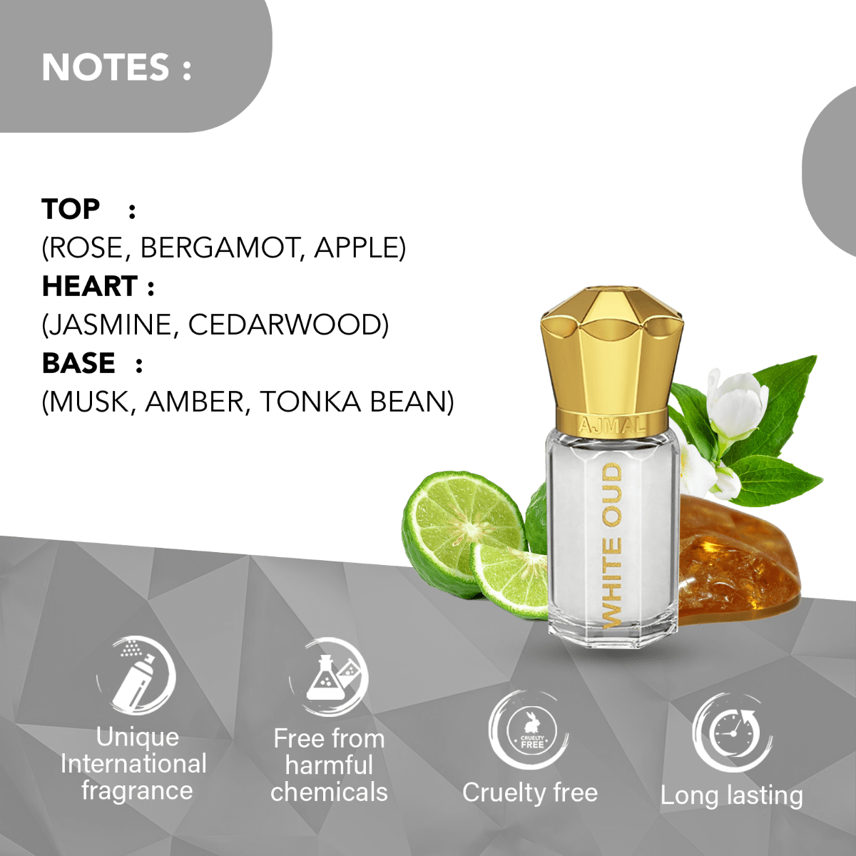 White Oud is a well-defined and charming scent that is floral & woody in nature. the top is a whimsical, fresh paradise of romantic rose and sparkling citrusy bergamot twirling and swaying to the tunes of luscious apple, in its delicate and prominent heart lies the distinct concoction of warm and woody cedarwood dipped in the ultra sensual and intoxicating jasmine while the rich and deep base of mellow musk gently soaked in the sweet and rich notes of amber & tonka bean awakens your senses and heightens your imagination as you become receptive to experience that life has to offer.