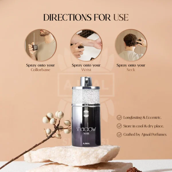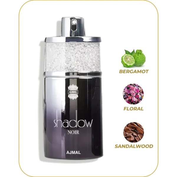 Ajmal Shadow Noir illuminates the magic inside you, Shadow Noir is a mysterious blend of citrusy bergamot at top, bewitching floral touch of jasmine and rose at heart, with woody base of Sandalwood and oakmoss. Enjoy the mystic wonder within you.